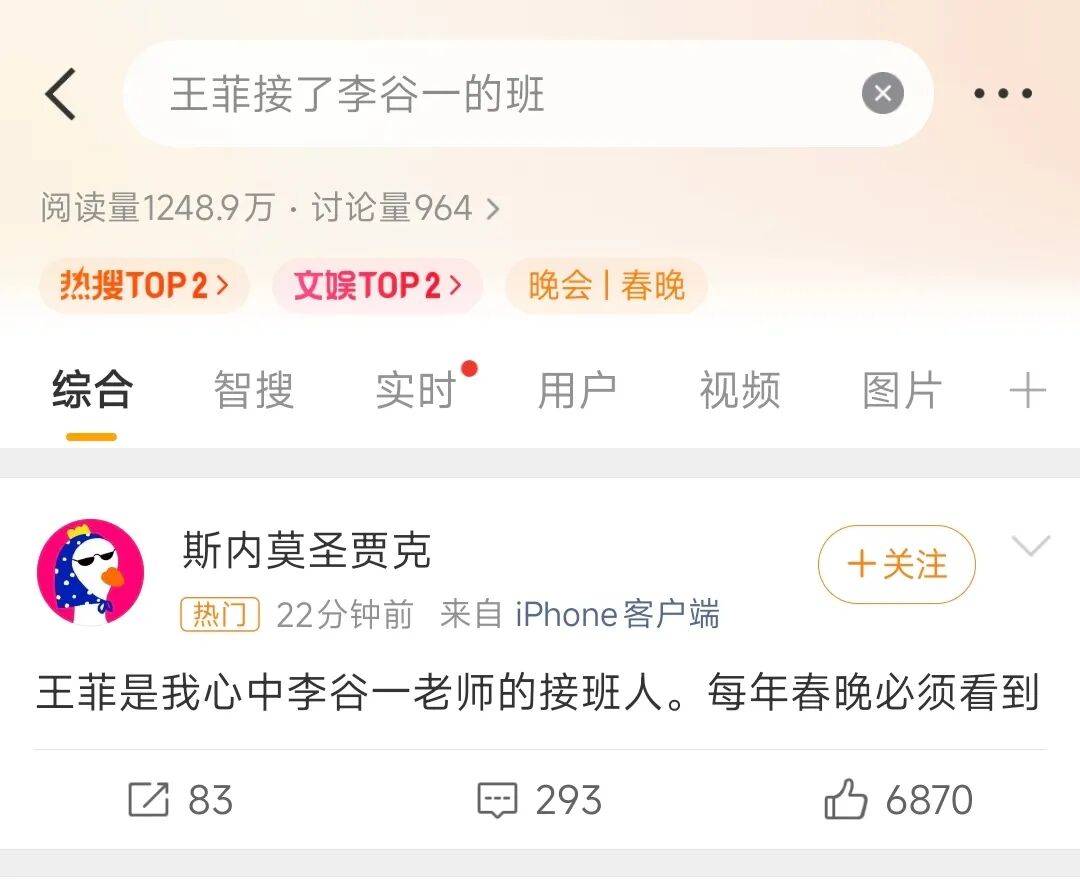 有网友开玩笑称:王菲是我心中李谷一老师的接班人,每年春晚必须看到。