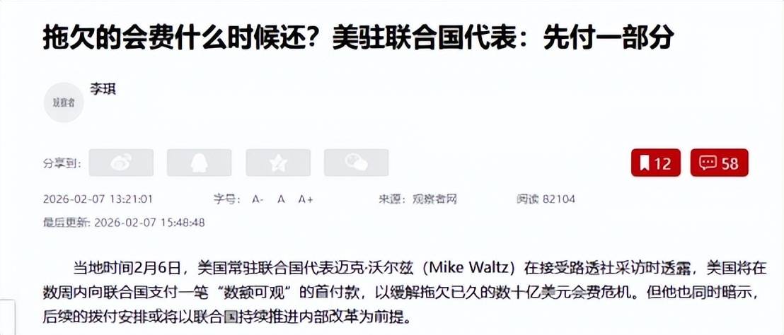 2月6日,美国常驻联合国代表迈克·沃尔兹表示,几周内将向联合国支付部分拖欠会费。