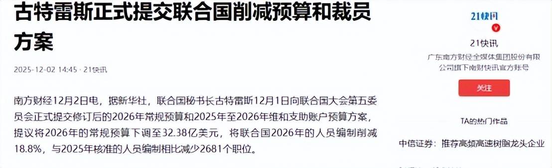 为了节省开支,古特雷斯已经在采取极端措施,包括裁员和预算下调等多方面,仅是裁员这一项,就有差不多2681个工作岗位被取消,后续维和和难民救助等核心工作也会受到影响。