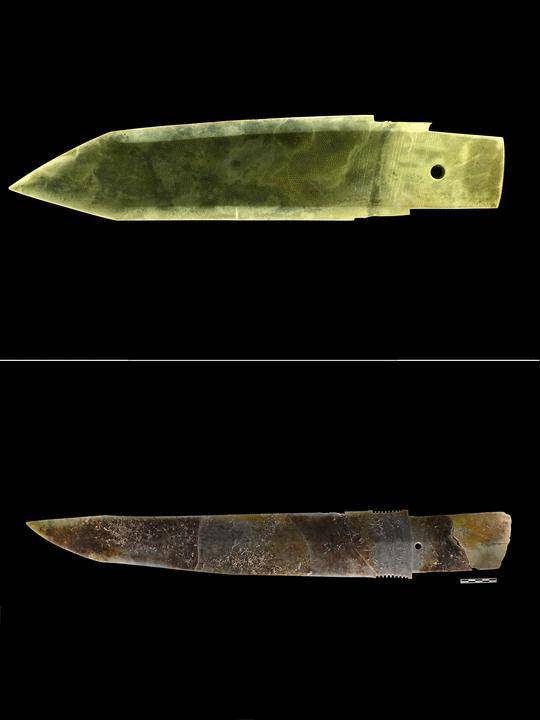 上图为二里头遗址出土的玉戈(中国社会科学院考古研究所二里头工作队提供);下图为郑州商城遗址出土的玉戈(郑州市文物考古研究院提供)。