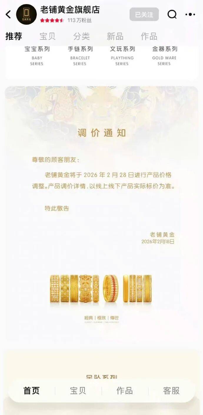 2月18日,老铺黄金官宣将启动2026年首轮提价。具体调价时间为2月28日,产品调价详情以线上线下产品实际标价为准。