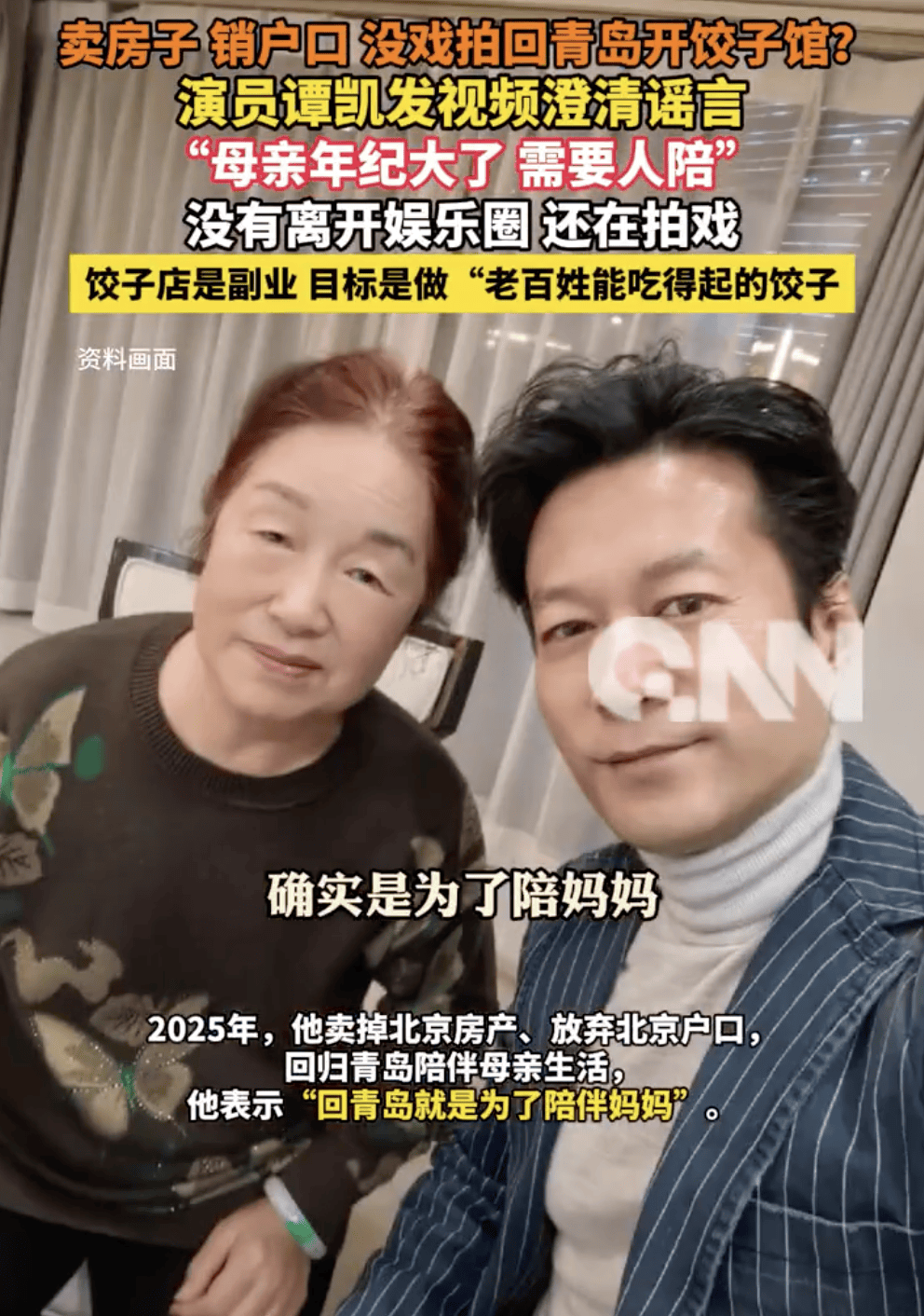 近日,有传言称54岁的演员谭凯卖掉房产、放弃北京户口,因无戏可拍而回青岛开了饺子馆。面对这些说法,谭凯发布视频回应,“我早就搬回青岛了,回青岛并不是为了开饺子店,母亲年纪大了,为了陪妈妈。而且开这个饺子店呢,其实并不是我凯哥没戏拍了,算是给自己添一个副业吧。”