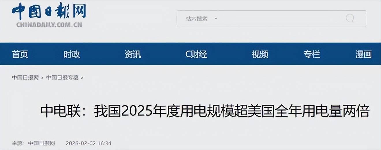 8、中电联:我国2025年度用电规模超美国全年用电量两倍(中国日报. 2026-02-02)