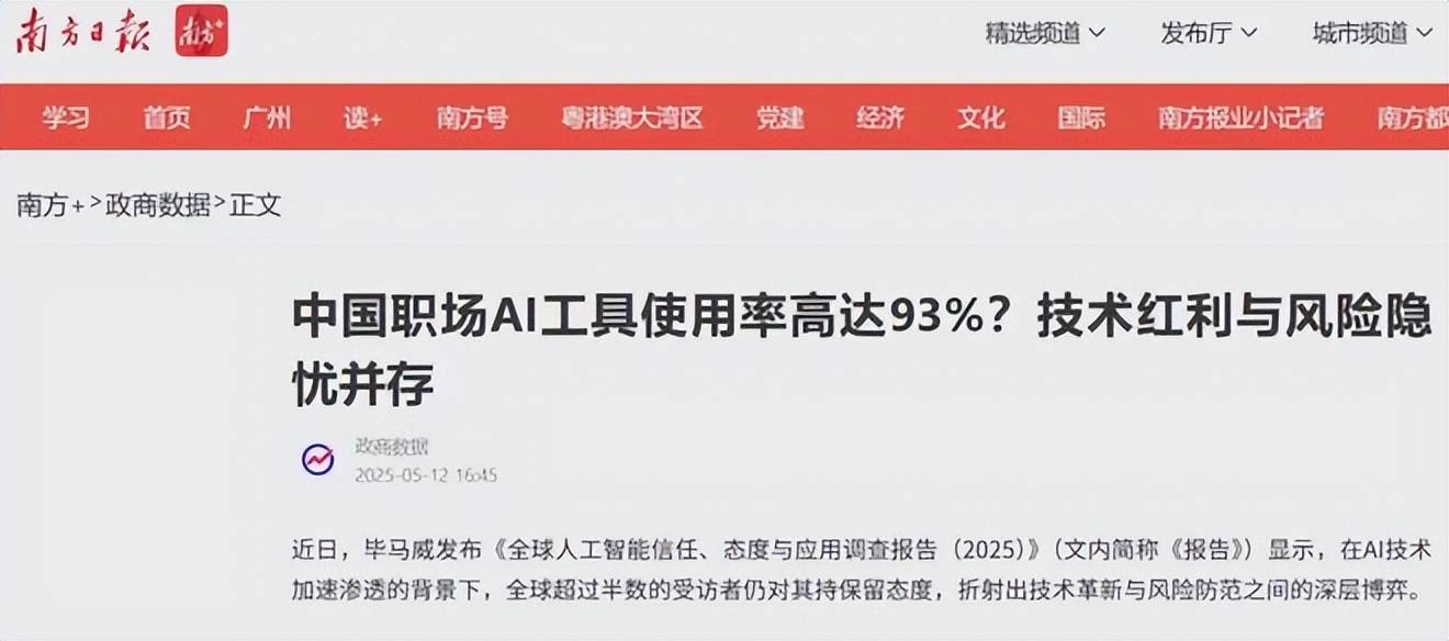 6、中国职场AI工具使用率高达93%?技术红利与风险隐忧并存(南方日报.2025-05-12)