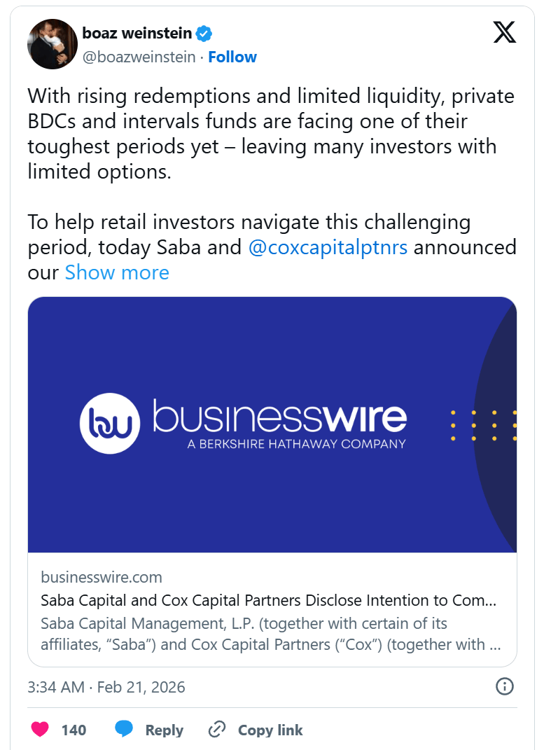 Blue Owl未就收购进行回应,Saba除周五声明和社交媒体帖子外,拒绝就其策略向媒体发表进一步评论。但市场已经用脚投票:私募信贷行业的信心危机才刚刚开始。