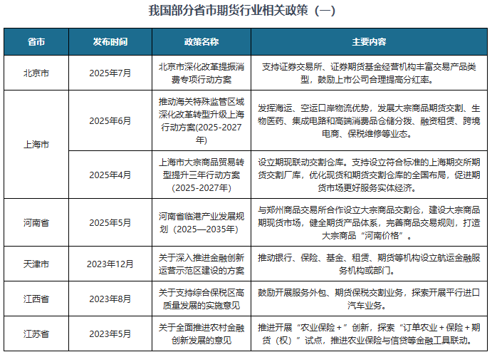 我国各省市也积极响应国家政策规划,对各省市期货行业的发展做出了具体规划,支持当地期货行业稳定发展,比如北京市发布的《北京市深化改革提振消费专项行动方案》、上海市发布的《推动海关特殊监管区域深化改革转型升级上海行动方案(2025-2027年)》。