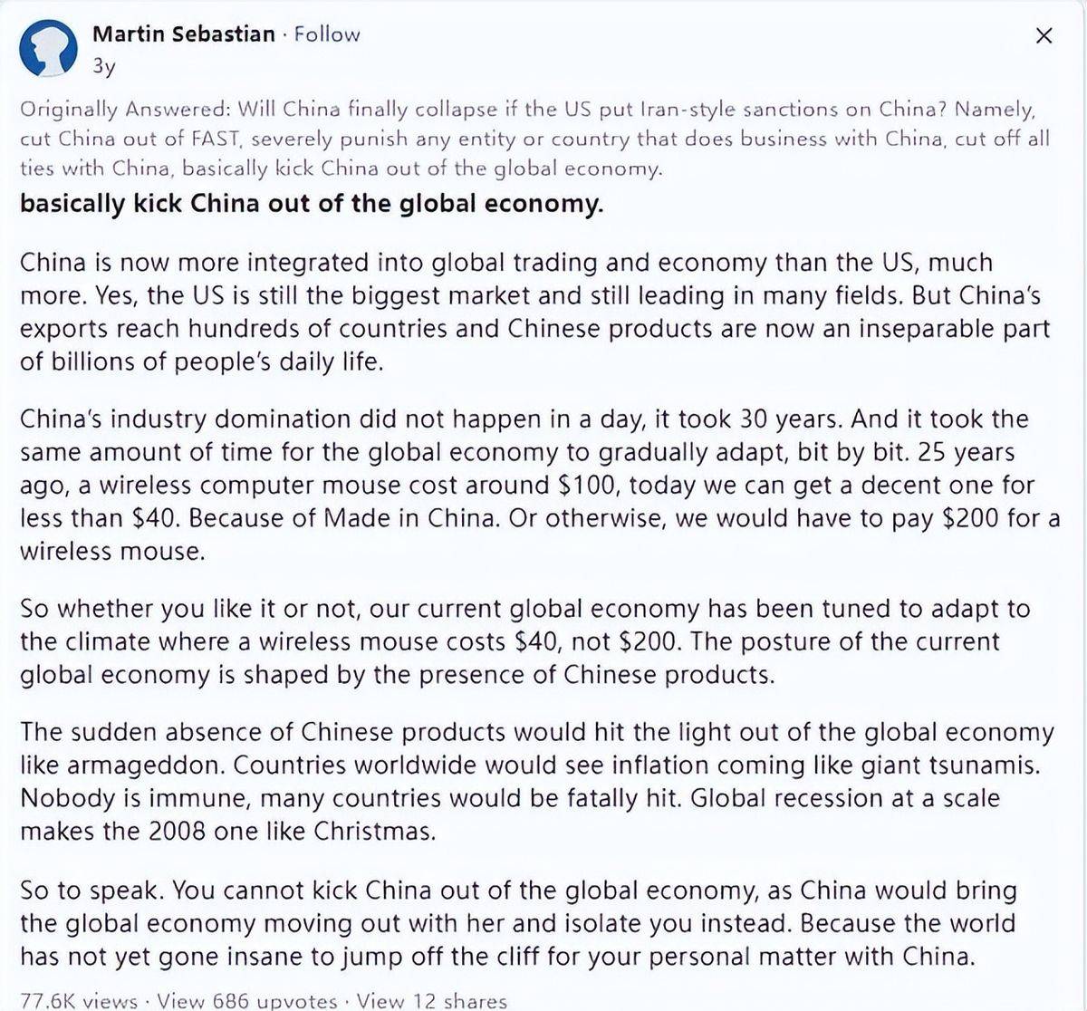 2026年,全球报告预测,若对中国实施制裁,将导致全球通货膨胀率上涨3%。尽管伊朗面临持续抗议,但仍未崩溃。中国的经济依然稳步增长,预计2025年将增长5%。一位论坛用户反思道,若照搬伊朗的制裁策略,美国自身的利益可能反而受损。全球已经离不开中国的制造业,采取这种行动将导致多方损失。中国有足够的能力实现自给自足,尤其是在高科技和能源领域,其独立供应链已非常强大。