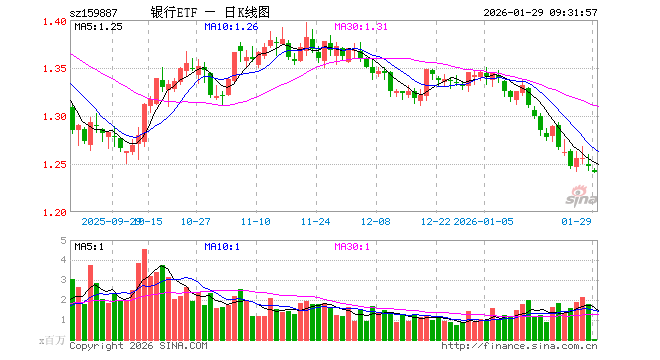 1月29日,银行ETF(159887)开盘跌0.32%,报1.243元。银行ETF(159887)重仓股方面,招商银行开盘涨0.21%,兴业银行涨0.11%,工商银行跌0.14%,农业银行跌0.59%,交通银行涨0.15%,浦发银行跌0.20%,江苏银行涨0.00%,平安银行涨0.00%,上海银行涨0.11%,民生银行涨0.27%。