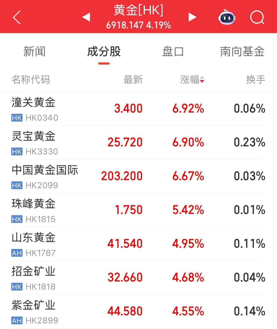 黄金股走强,潼关黄金、灵宝黄金、中国黄金国际涨超6%,中国黄金国际涨近7%,山东黄金、资金矿业、招金黄金涨超4%。