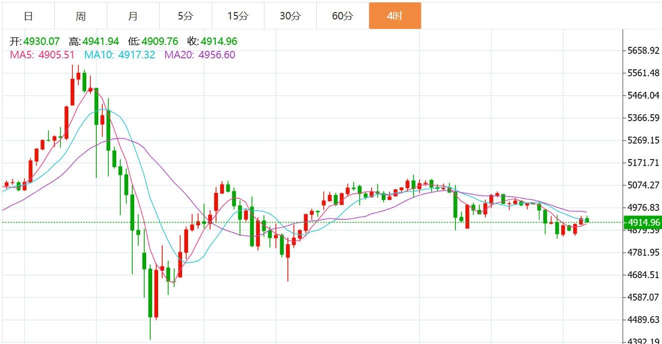 黄金技术面分析:黄金上个交易日走出一波延续的下跌日线报收一根中等实体阴线,原油上个交易日走出一波冲高回落日线报收一根带上影线的寸头阴线,实时行情盘中指导。黄金目前在日线走势上价格开始慢慢跌破前期的窄幅震荡区间,短周期均线开始逐步勾头向下发散在日线走势上有开始逐步走弱的意思,短期关注下有没有小幅反弹确认之后的二次下跌走势。4小时级别走势上目前维持着横盘震荡下跌,继续横盘震荡下跌的节奏,K线也继续承压短周期均线维持偏弱一些走势,倾向于在日内可能会继续维持这样的节奏,短线关注下4915-20一带的压力带。小级别周期走势上目前走出一波反弹,短线走势稍偏强一些但是延续的力度可能不会走的太大,关注下短线调整。综合来看,黄金今日短线操作思路上贺博生建议以反弹高空为主,回踩低多为辅,上方短期重点关注4960-5010一线阻力,下方短期重点关注4860-4810一线支撑。