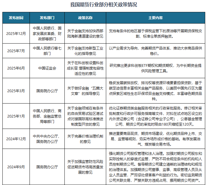 为了进一步推动期货行业的发展,我国陆续发布了多项政策,如2025年12月中国人民银行、国家发展改革委、财政部等部门发布《关于金融支持加快西部陆海新通道建设的意见》支持有条件的地区基于保税监管下的原油等开展期货保税交割、标准仓单质押融资。