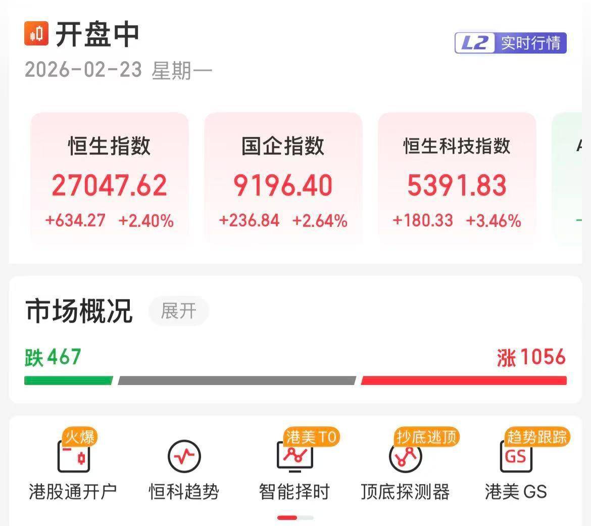 2月23日,当大家还继续享受春节超长假期的团聚与松弛感时,港股迎来了周一正常的交易日。恒生指数涨2.40%、恒生科技涨3.46%,个股涨多跌少。与此同时,富时中国A50指数期货涨幅扩大至1%。在港股与A股的关联性越来越强的今天,港股良好的开局,也给3亿A股股民朋友带来了一份乐观的期待。