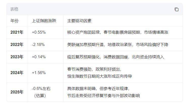 从近五年春节后首个交易日的表现来看,2021–2025年期间,5年中有3年实现上涨(2021年、2023年、2024年),2年下跌(2022年、2025年),上涨概率为60%,与近十年整体规律一致。