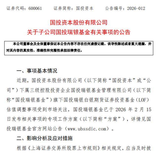 就事项基本情况,公告介绍,近期,公司下属三级控股投资企业国投瑞银基金管理有限公司(以下简称“国投瑞银基金”)旗下国投瑞银白银期货证券投资基金(LOF)估值调整事项受到市场关注,国投瑞银基金已于2026年2月15日发布相关事项的专项工作方案(以下简称“方案”)。对此,读创财经曾有报道(https://appdetail.netwin.cn/dc-h5s/dc_new/newdetail?id=s6991ce3be4b0da3882d41b49)。