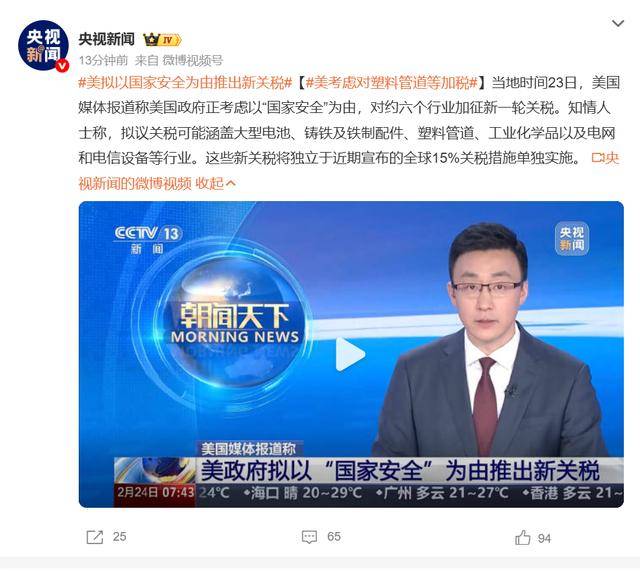 当地时间23日,美国媒体报道称美国政府正考虑以“国家安全”为由,对约六个行业加征新一轮关税。