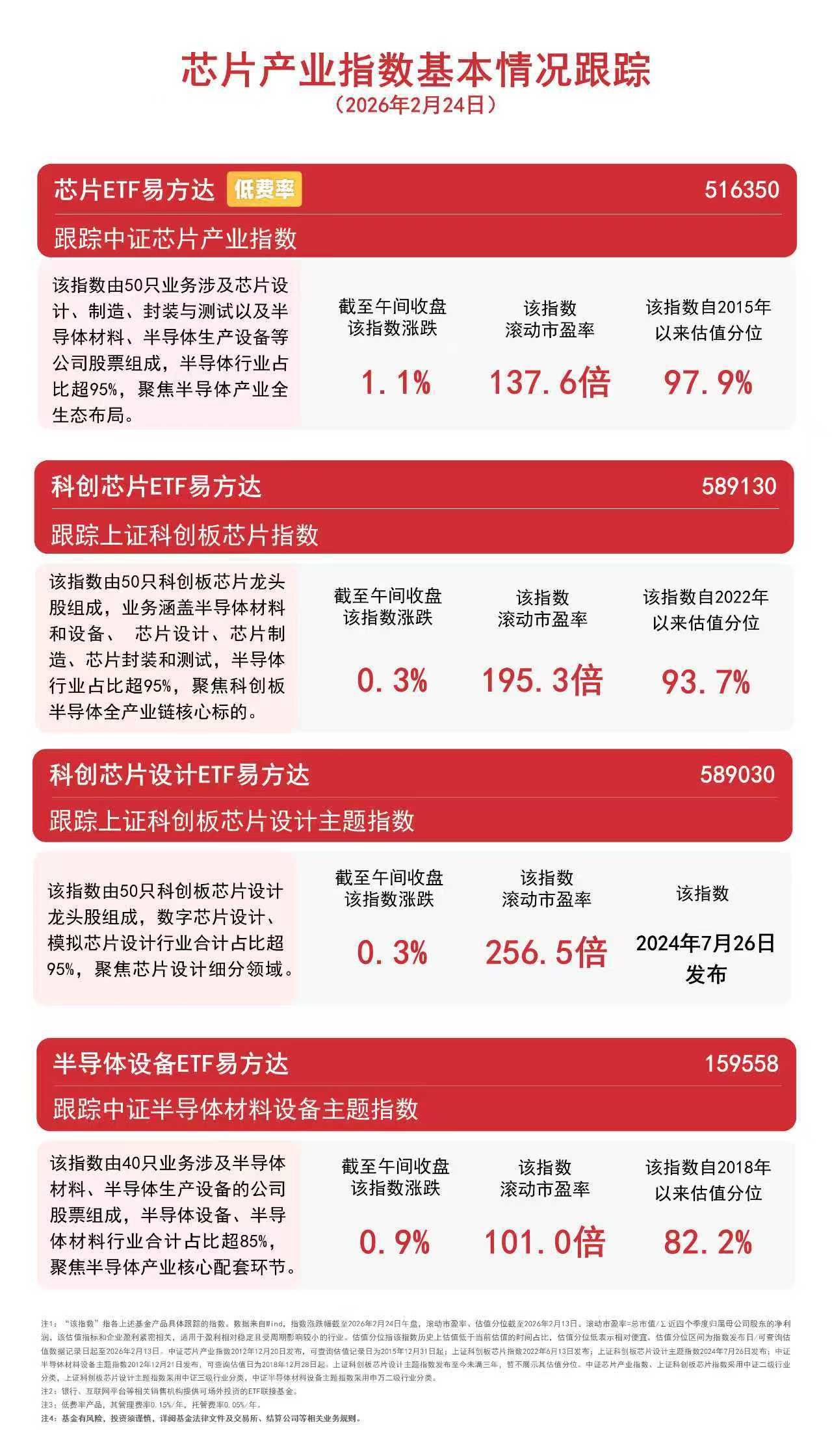 2月24日,A股主要指数集体走强,个股涨多跌少,芯片半导体板块高开下探后持续拉升。截至午间收盘,中证芯片产业指数上涨1.1%,中证半导体材料设备主题指数上涨0.9%,上证科创板芯片指数、上证科创板芯片设计主题指数均上涨0.3%。