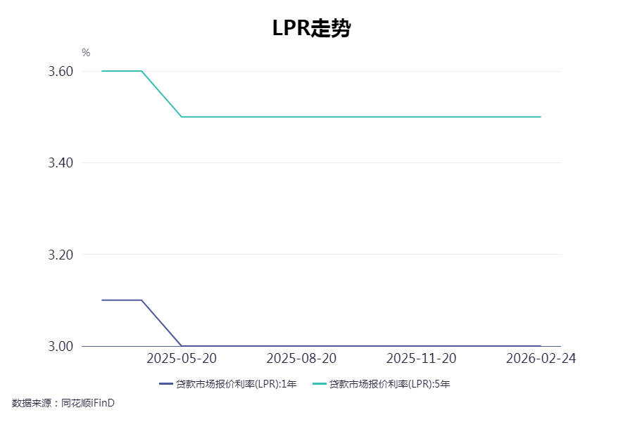 明明团队分析,2025年5月LPR报价跟随央行逆回购利率下调10个基点后,利率工具持续企稳,截至2026年2月逆回购政策利率再无调整,1年期、5年期LPR报价对央行7天期逆回购利率加点分别维持在1.6个百分点和2.1个百分点。