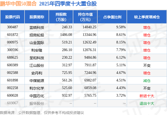 根据2025基金年报公募基金重仓股数据,重仓该股的公募基金共13家,其中持有数量最多的公募基金为鹏华基金的鹏华中国50混合。鹏华中国50混合目前规模为15.5亿元,最新净值2.889(2月13日),较上一交易日下跌1.73%,近一年上涨66.9%。该公募基金现任基金经理为王云鹏。王云鹏在任的基金产品包括:鹏华新材料混合发起式A,管理时间为2023年3月28日至今,期间收益率为40.25%;鹏华信用增利债券A,管理时间为2026年2月11日至今,期间收益率为-0.08%。