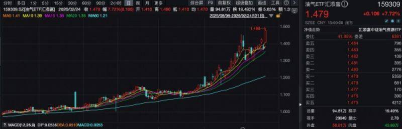 截至2月24日收盘,油气ETF汇添富(159309)以超7%的涨幅领跑全市场ETF,成为较为亮眼的品种。该基金跟踪中证油气资源指数,成份股中通源石油、中海油服等个股批量涨停,中国海油、中国石油等权重股涨幅亦居前。消息面上,假期期间地缘政治冲突升级及国际油价持续上攻成为直接催化因素。有分析指出,全球供给端不确定性增加,叠加需求预期回暖,推动了油气板块的风险偏好迅速回升。