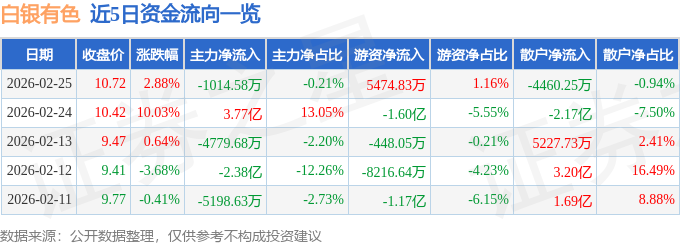 证券之星消息,截至2026年2月25日收盘,白银有色(601212)报收于10.72元,上涨2.88%,换手率5.96%,成交量441.56万手,成交额47.35亿元。