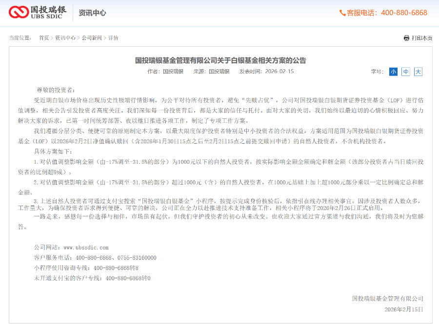 2月15日,国投瑞银基金管理有限公司发布公告称,受近期白银市场价格出现历史性极端行情影响,为公平对待所有投资者,避免“先赎占优”,公司对国投瑞银白银期货证券投资基金(LOF)进行估值调整,相关公告引发投资者高度关注,公司已第一时间统筹部署、夜以继日推进各项工作,制定了专项工作方案。公司遵循分层分类、便捷可靠的原则制定本方案,以最大限度保护投资者特别是中小投资者的合法权益。