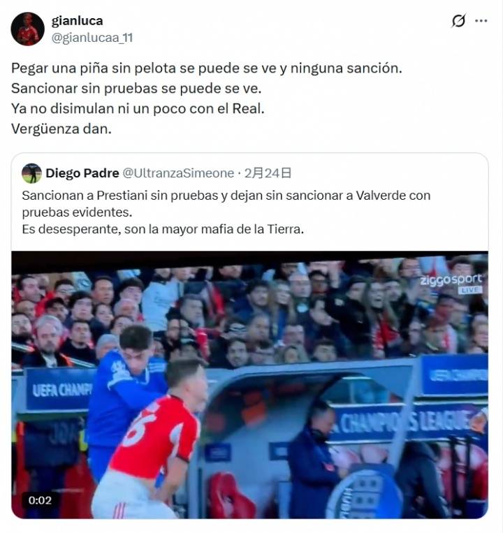 在本菲卡上诉失败后,普雷斯蒂安尼在社媒写道:“无球状况下的恶意犯规可以视而不见,没有任何处罚,但没有证据的事情却依旧给予判罚。他们对皇马的偏袒已经丝毫不掩饰了,真是无耻!”