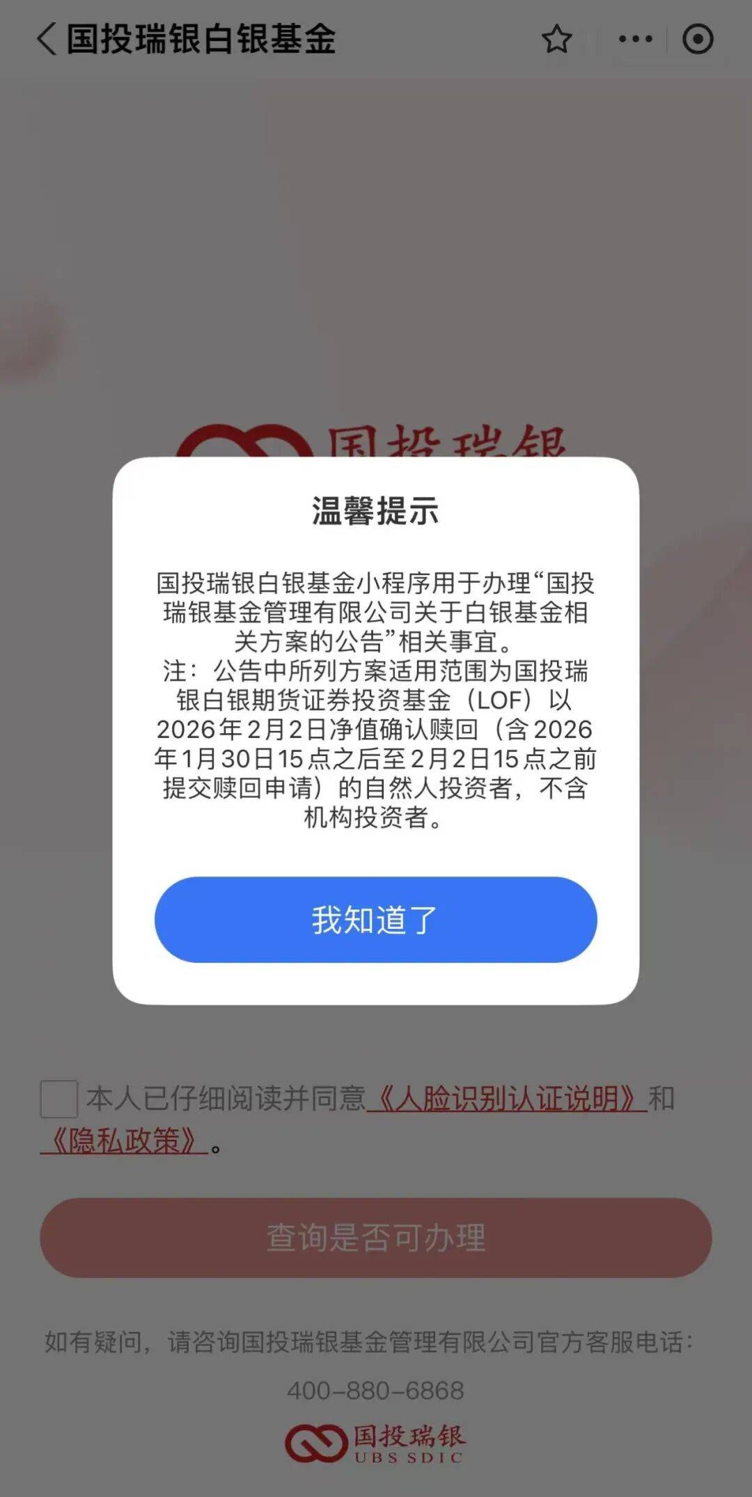 点击上述小程序,会看到明确提示:国投瑞银白银基金小程序,用于办理国投瑞银基金管理有限公司关于白银基金相关方案的公告的相关事宜。