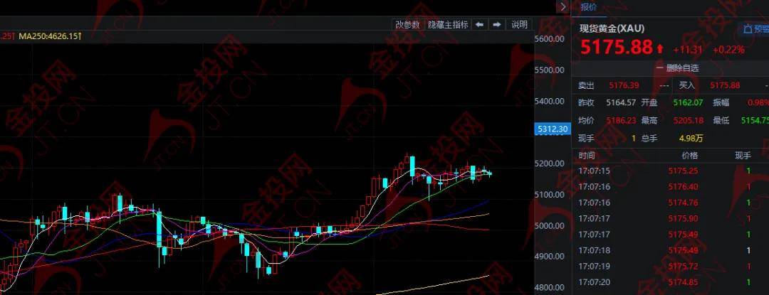 隔夜,现货黄金一度夺回5200美元关键关口但没能守住,最终收涨0.41%,报5164.96美元。今日欧市盘中,黄金小幅上涨,目前在5177美元附近徘徊。