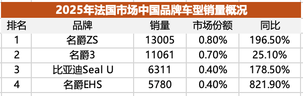 在法国市场,中国品牌2025年总销量达到5.57万辆,占据当地3.4%市场份额,略高于在德国市场的份额,但依然明显低于欧洲平均。
