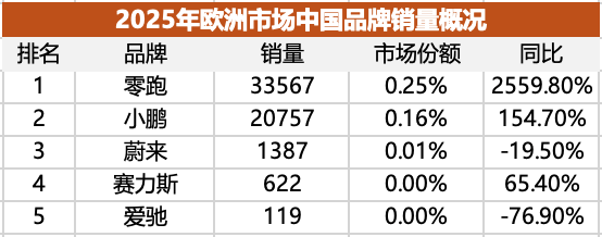 新势力品牌中,目前在欧洲表现最好的是零跑,2025年在当地销量达到3.36万辆, 这也是零跑在欧洲市场的爆发之年,销量同比暴涨25倍,在所有中国品牌中排名第五。小鹏销量仅次于零跑,2025年在欧洲售出2.08万辆,同比增长了155%。
