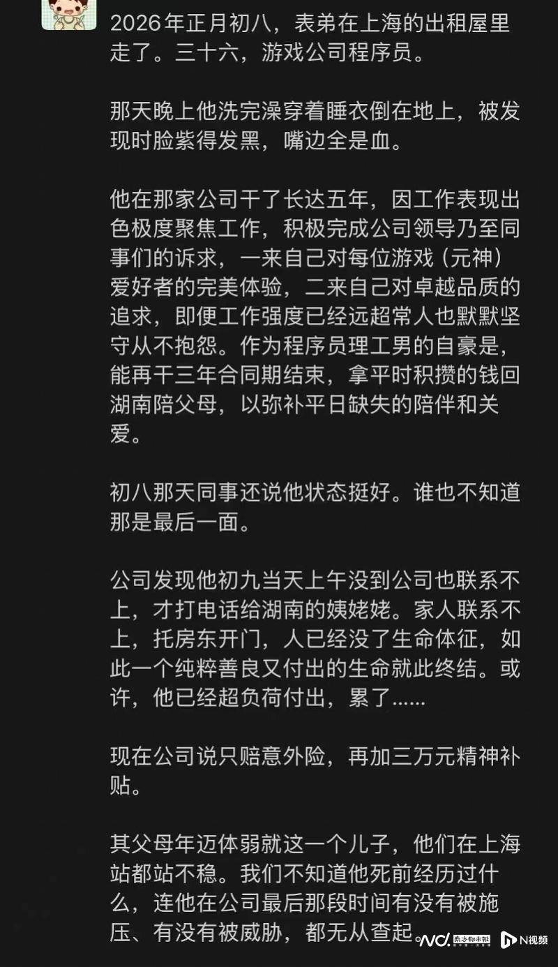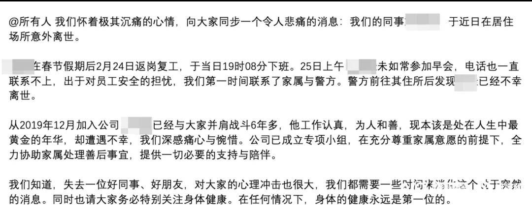 有自称其亲属者在朋友圈发文,“表弟于初八上班后,当晚在家不幸离世。因长期过度劳累、身心透支,骤然离去。”
