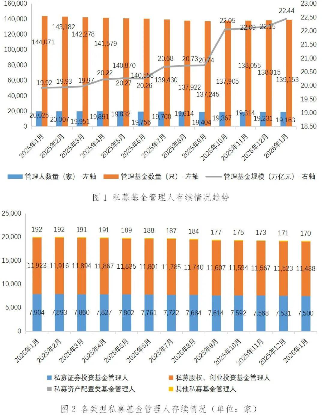 截至2026年1月末,存续私募基金管理人19163家,管理基金数量13.92万只,管理基金规模22.44万亿元。其中,私募证券投资基金管理人7500家;私募股权、创业投资基金管理人11488家;私募资产配置类基金管理人5家;其他私募投资基金管理人170家。