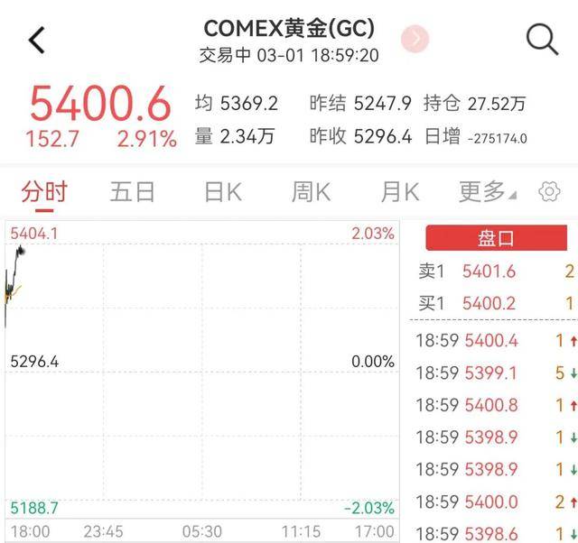 受中东局势动荡升级、避险情绪升温影响,国际黄金和原油价格大涨。截至3月2日发稿前,COMEX黄金价格为5400.6美元/盎司,涨幅为2.91%;伦敦黄金现货价格为5376.2美元/盎司,涨幅为1.86%。