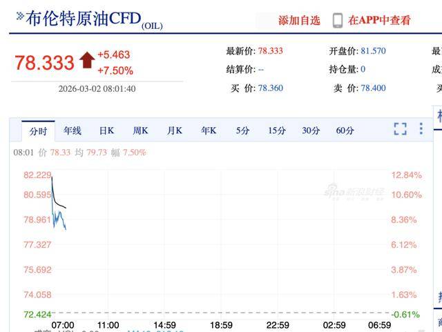 油价方面,布伦特原油开盘暴涨近13%,为81.57美元/桶。截至发稿前,布伦特原油报78.333美元/桶,涨幅为7.50%。