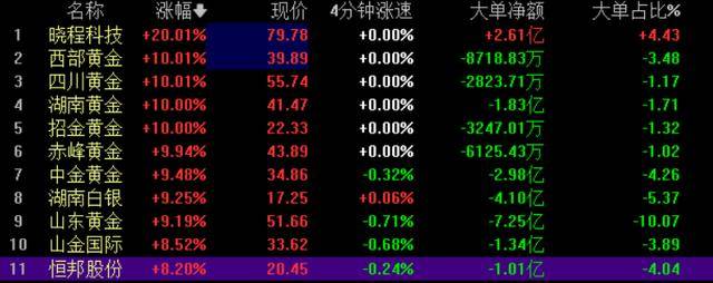 与此同时,贵金属板块持续拉升,同花顺贵金属板块个股最低涨幅都超8%。晓程科技(300139.SZ)四川黄金(001337.SZ)西部黄金(601069.SH)湖南黄金(002155.SZ)赤峰黄金(600988.SH)招金黄金(000506.SZ)涨停,湖南白银(002716.SZ)白银有色(601212.SH)等也临近涨停。