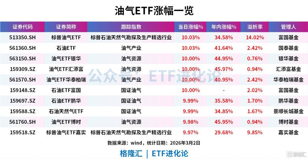 油气ETF领涨,标普油气ETF(513350)、石油ETF(561360)等涨停。