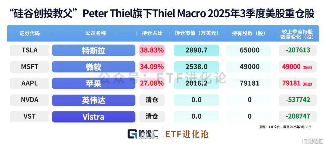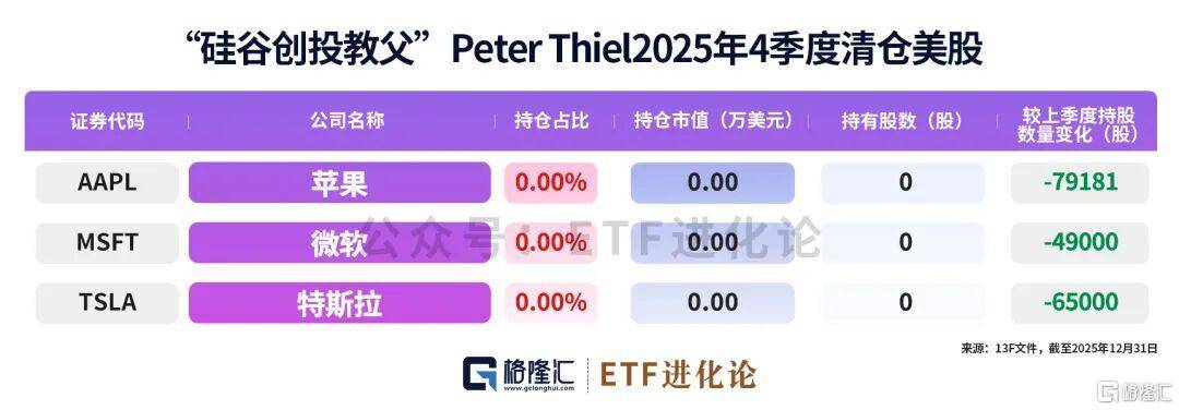 最新披露的美国13F文件显示,彼得·蒂尔旗下蒂尔宏观基金2025年四季度已清仓苹果、微软、特斯拉等所有美股持仓。
