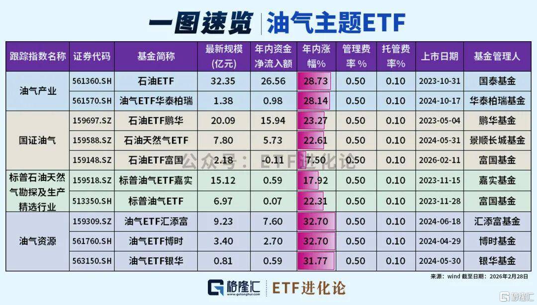 资金借道ETF流入油气板块。2026年开年以来,超60亿元资金净流入油气ETF,其中石油ETF(561360)、石油ETF鹏华(159697)分别获得了26.56亿元、15.94亿元的净流入。