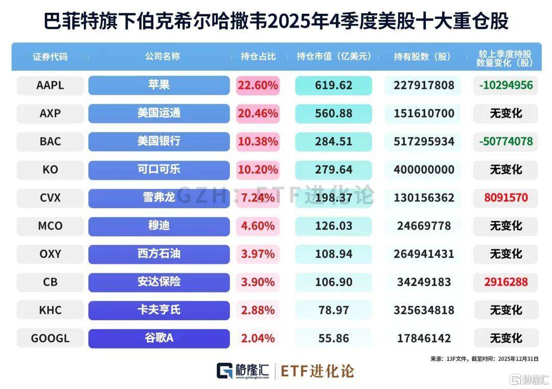 截至2025年末,伯克希尔持有的股票投资总公允价值中,约65%集中在五家公司:美国运通、苹果、美国银行、可口可乐和雪佛龙。