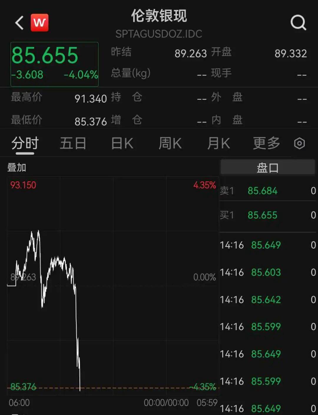 现货白银日内跌幅扩大至达4%,现报85.655美元/盎司。