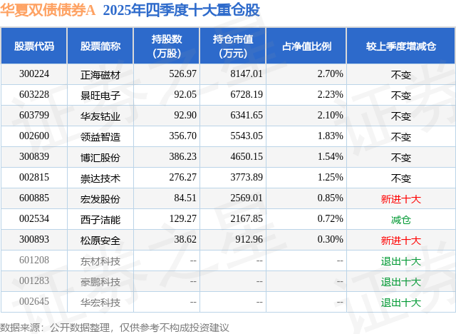 根据2025基金年报公募基金重仓股数据,重仓该股的公募基金共4家,其中持有数量最多的公募基金为华夏基金的华夏双债债券A。华夏双债债券A目前规模为20.94亿元,最新净值2.2045(3月2日),较上一交易日下跌0.26%,近一年上涨18.89%。该公募基金现任基金经理为柳万军。柳万军在任的基金产品包括:华夏纯债债券A,管理时间为2017年9月8日至今,期间收益率为36.98%;华夏永康添福混合A,管理时间为2019年7月15日至今,期间收益率为97.74%;华夏鼎清债券A,管理时间为2020年12月3日至今,期间收益率为24.73%。
