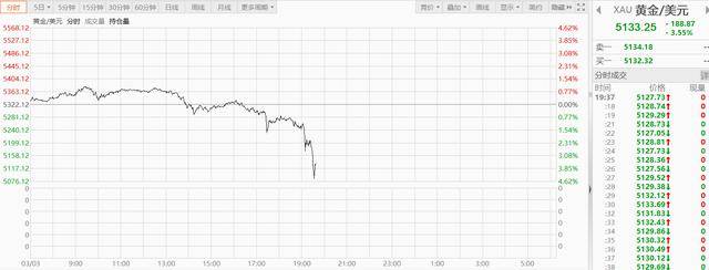 3月3日,现货黄金盘中跌超4%,迅速击穿5100美元/盎司。截至发稿,现货黄金下跌3.55%,报5133.25美元/盎司。