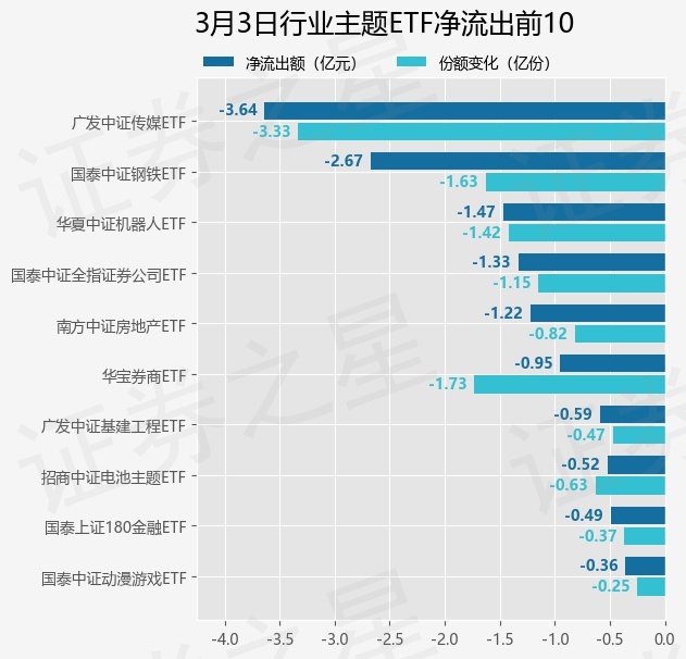 当日有102只行业主题ETF基金出现资金净流出,其中净流出排首位的是广发中证传媒ETF(512980),份额减少了3.33亿份,净流出额为3.64亿元。