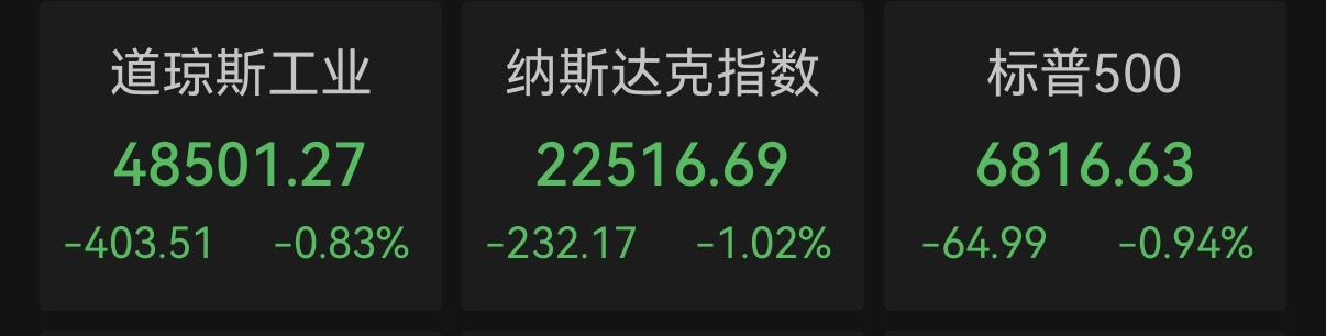 当地时间3月3日,美股三大指数集体收跌。Wind数据显示,截至收盘,道琼斯指数下跌403.51点,下跌0.83%,报48501.27点;纳斯达克指数下跌232.17点,下跌1.02%,报22516.69点;标普500指数下跌64.99点,下跌0.94%,报6816.63点。
