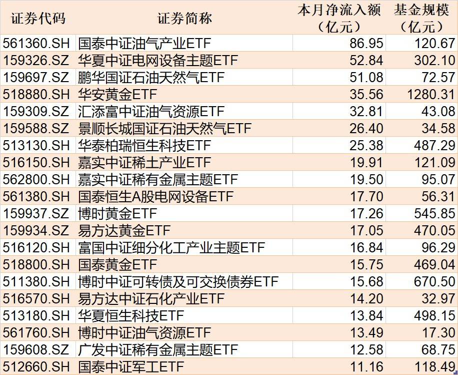 Wind数据显示,在3月5日的非货币ETF市场中,华夏中证电网设备主题ETF基金份额增加6.91亿份,净流入额14.21亿元;汇添富中证油气资源ETF基金份额增加6.87亿份,净流入额11.88亿元;华安黄金ETF基金份额增加0.83亿份,净流入额9.12亿元。