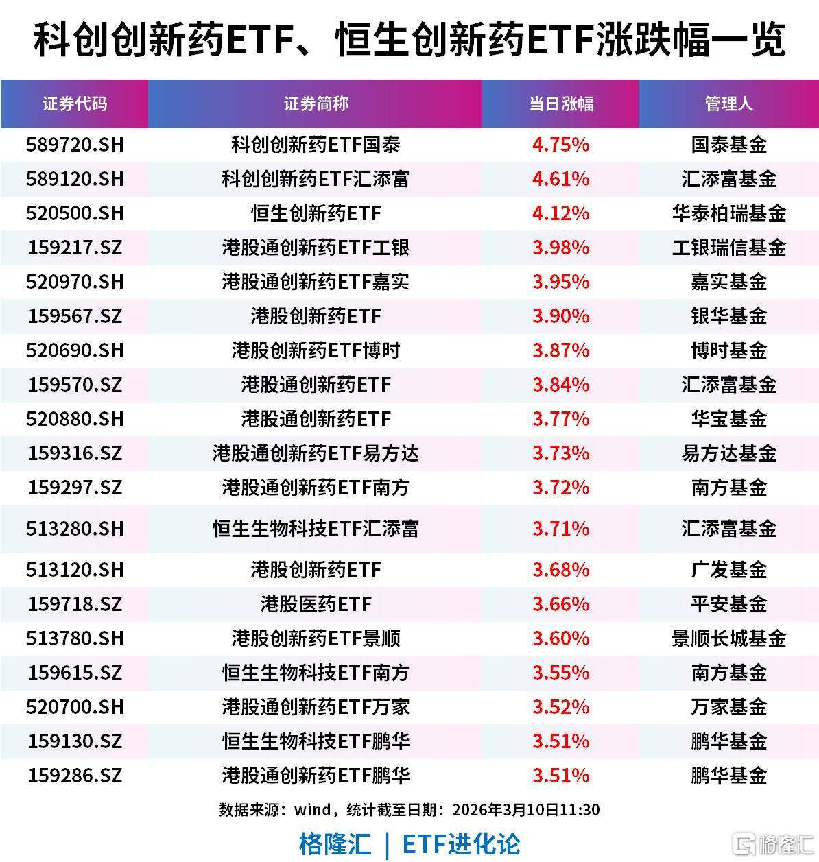 港股医药股上涨,科创创新药ETF国泰、科创创新药ETF汇添富、恒生创新药ETF涨超4%;港股通创新药ETF工银、港股通创新药ETF嘉实、港股创新药ETF、港股创新药ETF博时、港股通创新药ETF、港股通创新药ETF、港股通创新药ETF易方达、港股通创新药ETF南方、恒生生物科技ETF汇添富、港股创新药ETF、港股医药ETF、港股创新药ETF景顺、恒生生物科技ETF南方、港股通创新药ETF万家、恒生生物科技ETF鹏华、港股通创新药ETF鹏华涨超3.5%。