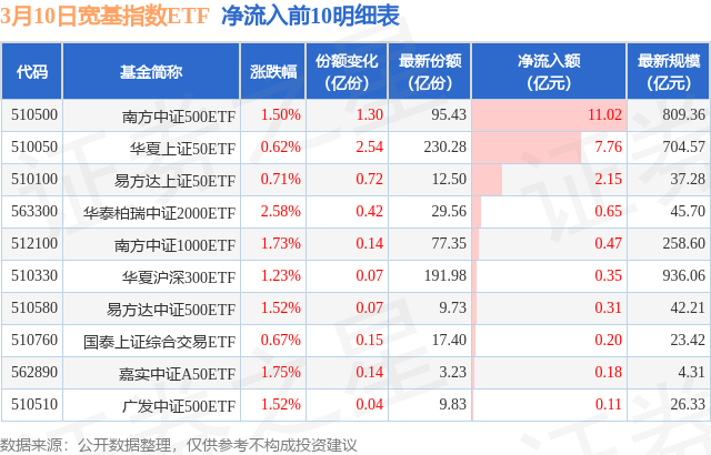 当日有22只宽基指数ETF基金出现资金净流入,其中净流入排首位的是南方中证500ETF(510500),份额增加了1.3亿份,净流入额为11.02亿元。