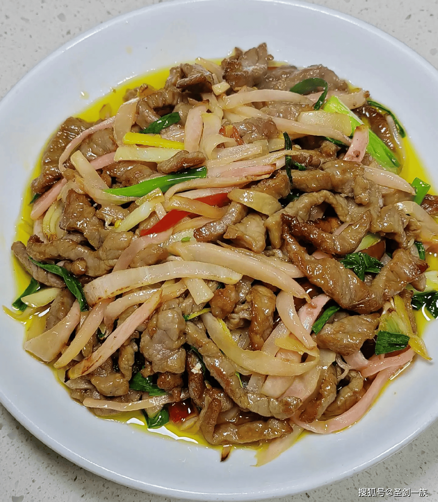 4. 点睛之笔:加入青红椒丝,淋入生抽老抽,大火翻炒30秒,让酱香包裹每一片食材~