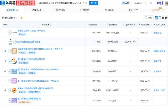 企查查APP显示,近日,福建省紫金矿业隐山双循环股权投资基金合伙企业(有限合伙)成立,出资额2.82亿元,经营范围包含:以私募基金从事股权投资、投资管理、资产管理等活动。企查查股权穿透显示,该公司由紫金矿业(601899.SH)全资子公司紫金矿业投资(上海)有限公司、厦门集美产业投资集团有限公司等共同持股。