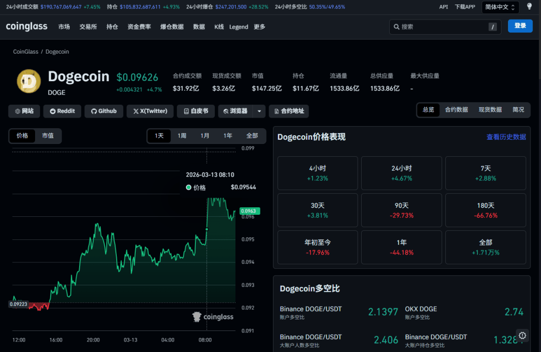 哎呀,看到CoinGlass上的数据,我整个人都兴奋起来了!狗狗币价格现在稳在0.09626美元,24小时直接拉涨4.7%!这波小火箭起飞的感觉,真的太解压了,你们是不是也跟我一样盯着K线直呼“干得漂亮”?